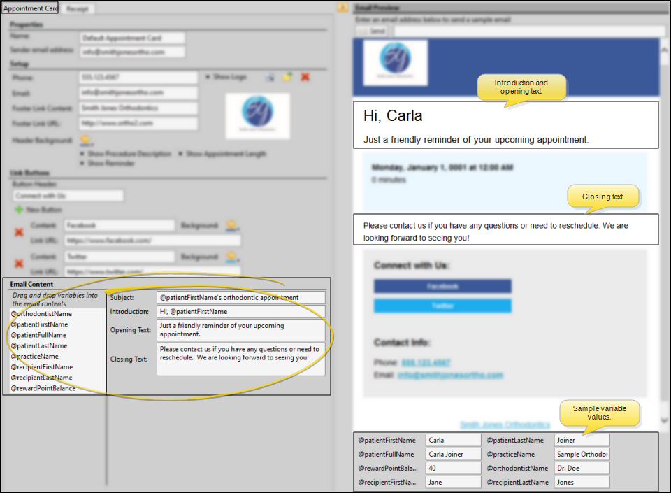 Opening Text - Type an opening sentence. such as "This is just a friendly reminder" in this field. You can optionally type or drag and drop variables, such as @patientName, from the variables list at the left of the window into your opening message.