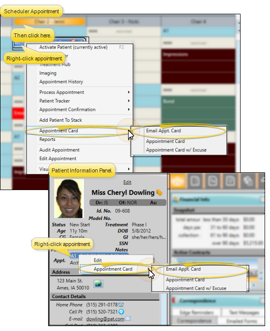 Right-click an appointment in the patient's Patient Information Panel, or in your Scheduler, or activate a patient in your Scheduler and select to generate an Appointment Card. When you select the email option, you can then choose to send the message to any email address associated with the patient. See "Appointment Cards" for details.