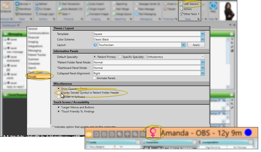 Use your Visual User Options to show / hide the gender identity icon in the patient folder header. These settings are specific to you, and will follow you on whatever computer you log into: Other operators may have different settings. See "Visual User Options" for details