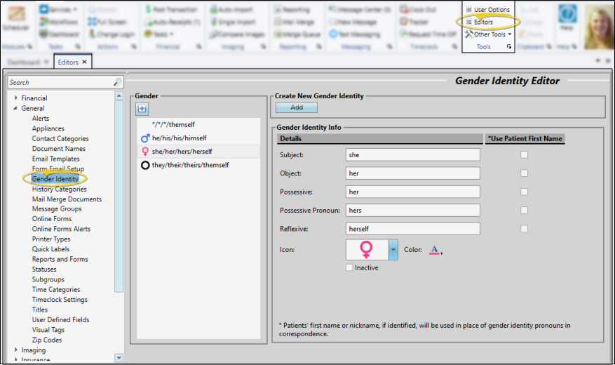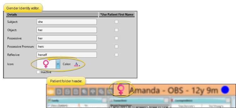 Use the Gender Identity editor to create a list of your patients' preferred gender pronouns. For each gender record, you can substitute the patient's first name or nickname for any pronoun type, and assign an icon that you can choose to display in the patient folder header.