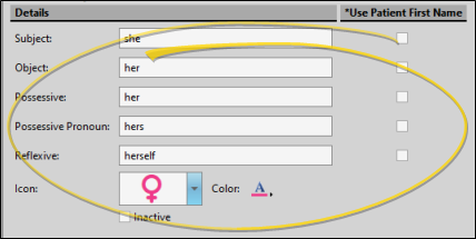 You can enter a pronoun for each field of the selected gender record, or enable the Patient Name option to use the patient's first name or nickname in lieu of a pronoun.