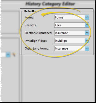 Use the Defaults section of the History Categories editor to assign a default category description to several types of forms. When you run one of these forms, it is automatically saved in the appropriate correspondence history with the selected category.