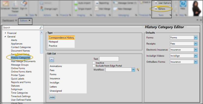 Use the History Category editor to set up the categories for sorting and filtering the forms and documents recorded in the correspondence histories and notepads of your patients, responsible parties, professionals, employees, and your practice.
