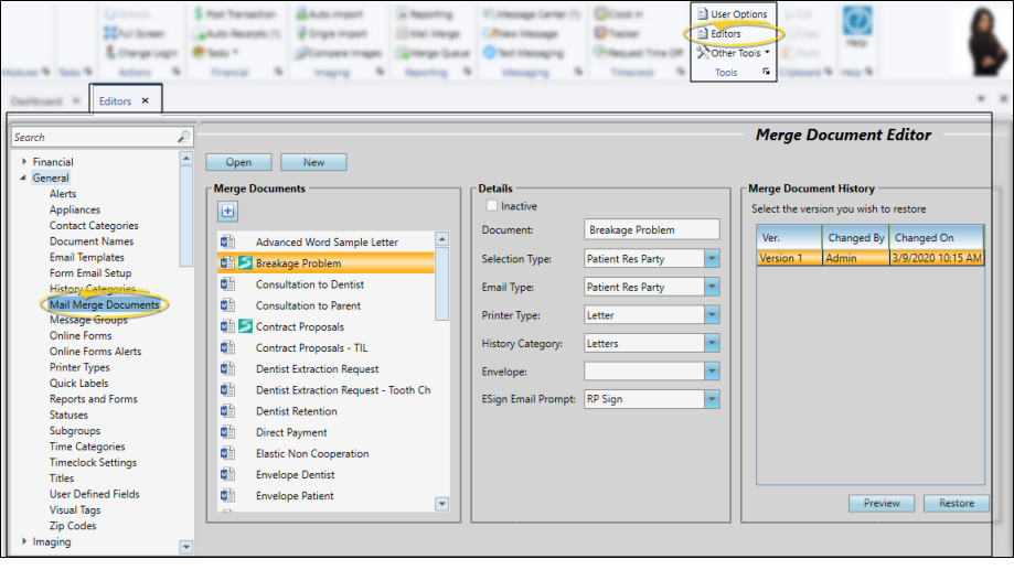 Select Editors from the Tools section of the Home ribbon bar. Then, from the General section, open the Mail Merge Documents editor. (You can also use the Search field to look for the editor you want to work with.)
