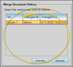 Use the Merge Document History section of the Mail Merge Documents editor to review a list of revisions made to the selected document. You can select a revision document from the list, and click Preview to see the letter as it was at that point in time, and click Restore to return the document to the selected state, overwriting any changes.