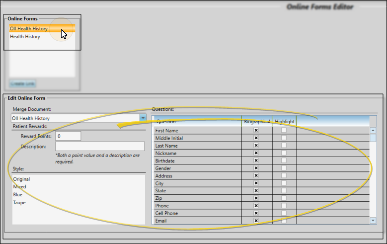 Use the Online Forms editor to select a style for your online forms, categorize form questions, assign Patient Reward points for completing a form, and link mail merge documents to processed forms. You can also create office and doctor specific links for your forms from this editor. These links can contain ad hoc metadata to help you track and filter your forms.