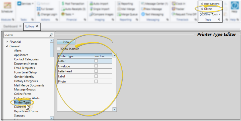Select Editors from the Tools section of the Home ribbon bar. Then, from the General section, open the Printer Types editor. (You can also use the Search field to look for the editor you want to work with.)
