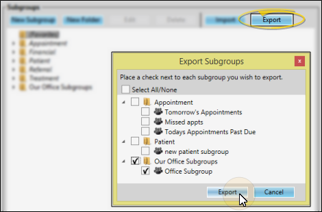 - Click Export to open the Export Subgroups window, and select each subgroup you wish to export. You can only export subgroups you have created or imported: You cannot export built-in subgroups. Then, click Export, and choose a location and file name for your exported file. You can now share the file with others.