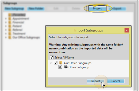 - Click Import to open the Import Subgroups window, and locate the exported file you want to work with. Select each subgroup you want to add to your system, and click Import. The new subgroups will be imported with their original folder and file names, overwriting any existing files with matching names.