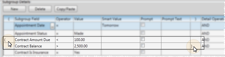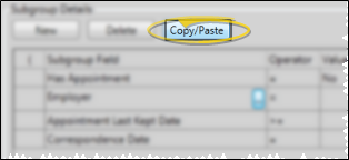 - Click the criteria you want to work with, then click Copy / Paste in the Subgroup Details section of the window to add a copy of the detail to the bottom of the list. You can now edit that criteria as needed.