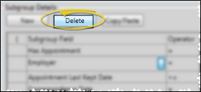 - Click the criteria you want to remove from the subgroup, and click Delete in the Subgroup Details section of the window. This only deletes the criteria you selected, it does not delete the entire subgroup. (See Delete a Subgroup or Folder above to remove a subgroup from your system.)