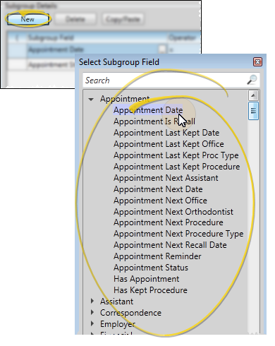 - Click New in the Subgroup Details section of the window to add new criteria to your subgroup. Scroll through the Subgroup Field list, and choose the one you want to work with (You can also search for a subgroup field). Your selected field is added to the bottom of your subgroup. You can now edit the details about how to evaluate this criteria, as described below.