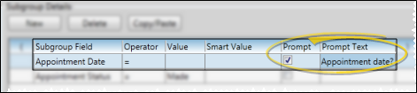 Prompt for a Value - If you want to enter the value at the time you run the subgroup, enable the Prompt option. Then, type the question to display in the Prompt Text box. Whenever you use this subgroup, the question you typed will pop onto your screen, waiting for you to enter the appropriate value to use for this subgroup job.