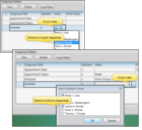 Select From a List - If you are working with a subgroup field whose response is from a list, you may select one or any number of responses from that list to evaluate. To select a single response, click the Value field, and select the response you want to evaluate. To select multiple responses, click the [...] button beside the Value field and place a checkmark beside each response you wish to evaluate.