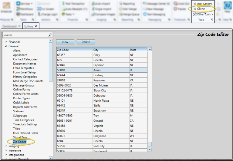 Select Editors from the Tools section of the Home ribbon bar. Then, from the General section, open the Zip Code editor. (You can also use the Search field to look for the editor you want to work with.)