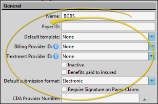 Enter claim submission details and preferences for this insurance company in the General section of the window.