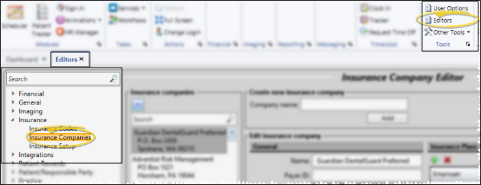 Select Editors from the Tools section of the Home ribbon bar. Then, from the Insurance section, open the Insurance Companies editor. (You can also use the Search field to look for the editor you want to work with.)