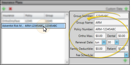 Select the plan you want to work, then use the fields at the right to add and edit the, including the group number and name, policy number, maximum benefits, renewal date and deductibles. Note that the fields available may be different, depending on whether you have Edge Specialist or integrate with Canadian CDAnet/ITRANS insurance processing.