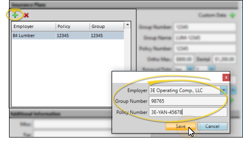 Click Add and enter the name, group number and policy number. If you add a plan from the Insurance Company editor, you also specify the employer; if you add a plan from the Employer editor, you specify the insurance company. If you add a plan from the Responsible Party page of the patient folder, the employer is left blank.