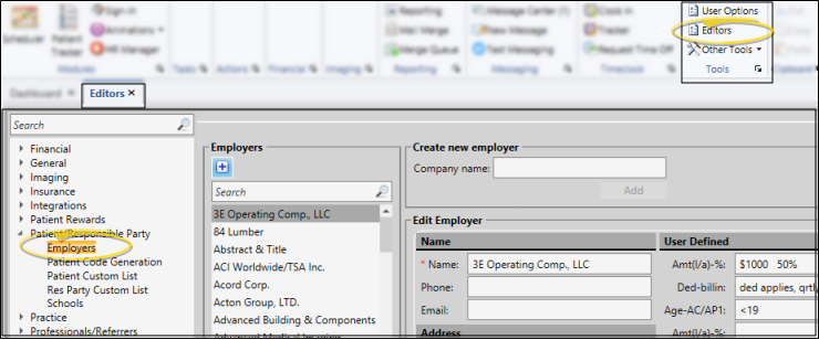 Home Ribbon Bar - Select Editors from the Tools section of the Home ribbon bar. Then, from the Patient / Responsible Party section, open the Employer editor. (You can also use the Search field to look for the editor you want to work with.)