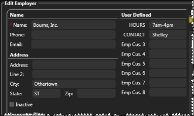Use the Employer editor to track the employment and employer-based insurance coverage, of your responsible parties. The editor includes the employer name, address, phone number, insurance plan, several user-defined fields, and a notepad you can use for additional information.