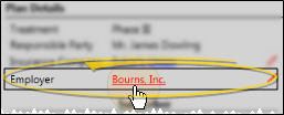 Patient Folder - Open the Insurance Detail page of the patient folder, then click the underlined employer name in the Plan Details section of the window to open the Employer editor with that company selected. (You can also click the Edit icon to change the employer assigned to the insurance plan. This does not change the employer assigned to the responsible party record.)
