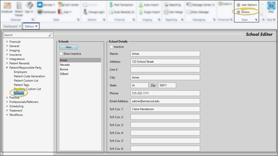 Select Editors from the Tools section of the Home ribbon bar. Then, from the Patient / Responsible Party section, open the Schools editor. (You can also use the Search field to look for the editor you want to work with.)