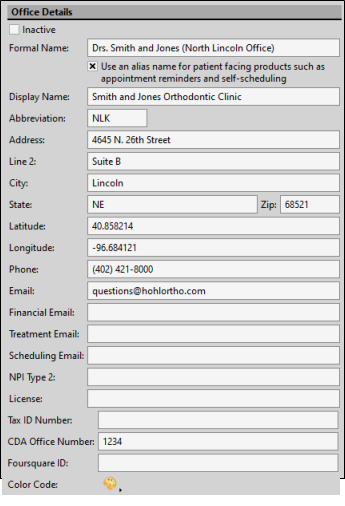 Name / Alias - Use the Name field to enter the name of this office. If you have multiple offices, be sure the name is different enough so it is easy to select the correct location for your patient folders. You can optionally enable the Alias option, then enter a Formal Name for your own purposes, and a Display Name to use when your patients receive communications via your online services, such as Online Scheduling and Edge Reminders. The name is included on your Practice Connect app.