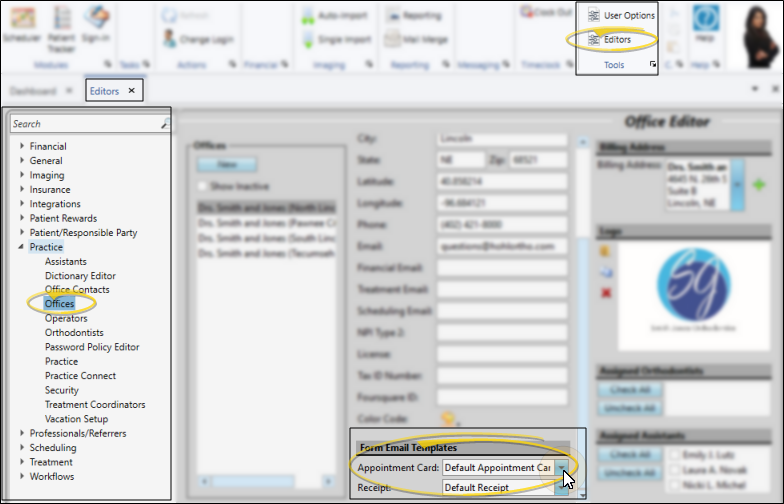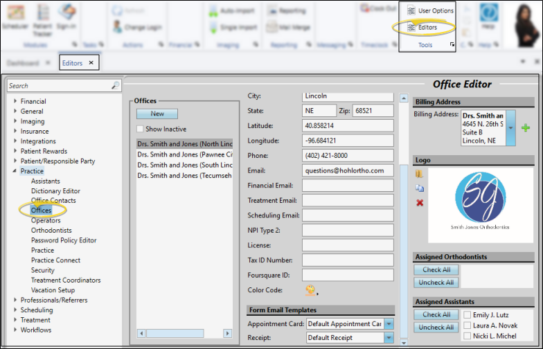 Select Editors from the Tools section of the Home ribbon bar. Then, from the Practice section, open the Offices editor. (You can also use the Search field to look for the editor you want to work with.)