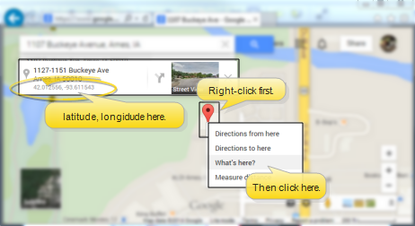 Latitude / Longitude - Enter the latitude and longitude of this office to allow patients to sign in for their appointment once they come within a certain distance of your office. To find the coordinates, go to www.maps.google.com and enter your street address. Right click the location on the map and select What's Here? Under the search box, an information card with the coordinates will appear. Latitude is listed first, then longitude.