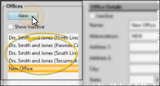 Click New to create a new office location for your practice, or choose to work with an existing record. If not all your records appear in the list, enable the Show Inactive option.