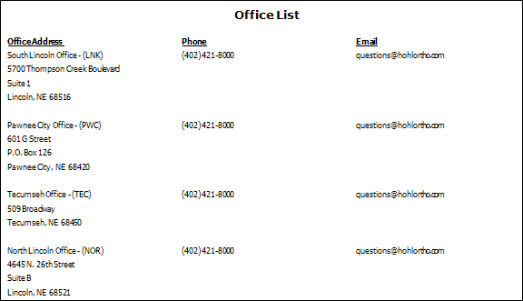 Run the Office List report to obtain a list of the active records in your Office editor. The report includes the office name, abbreviation, address, phone number, and main email address. Additional email addresses in the Office editor, such as the Financial and Scheduling emails, are not included in this report. Only active records are included in the report: Any items flagged Inactive in the editor are omitted. See "Office List" for details.