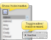 Select Existing Record - Your list of existing records appears at the left. Click the record to work with, then review and edit the details at the right. You can use the Inactive option in the record details to toggle the active / inactive status of an record. If not all your records appear in the list, use the Show / Hide Inactive icon at the top of the window to include both active and inactive records. (You can also use the Search field to find the record you want to work with.)