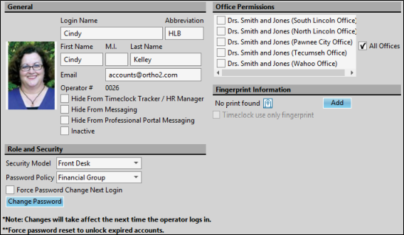 You can assign each operator account to one or more specific offices, thus providing further data security, as the operator will only have access to the data from assigned offices. You can also assign specific assistants and orthodontists to offices, further limiting an operator's security access to that data as well.