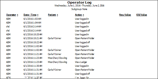 Run an Operator Log report to review operator activity for various functions within Edge Cloud, including patient folder access, login history and reporting access, for any range of dates. You can run the report for specific activities, or include all reportable functions, and include the activity from only certain operators, or all operators in your Edge Cloud system. The report includes the operator abbreviation, date and time of the event, patient folder accessed (if any), description of the activity, and the old and new values of changed financial data (if any). See "Operator Log" for details.