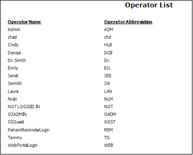 Run the Operator List report to obtain a list of the names and abbreviations of the active operator accounts in your Edge Cloud system. Only active records are included in the report: Any items flagged Inactive in the editor are omitted. See "Operator List" for details.