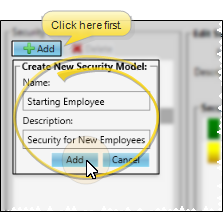 Create a New Model - Click Add at the top of the window. Enter a brief name, and a description of the purpose of the security model, and click Add at the bottom of the box.