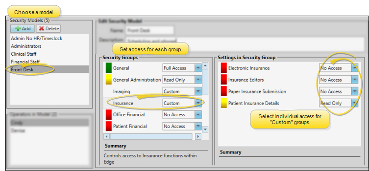 Use the Role and Security section of the Operator editor to select the security model for each person that uses Edge Cloud in your practice. See "Operator Editor" for details.