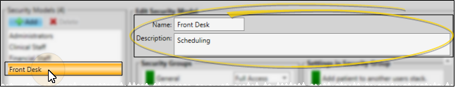 Name and Description - Select a security model from the list at the left. If you have just created a new model, it is selected automatically. You can then edit the group name and description as needed.