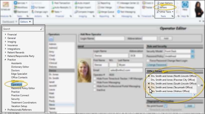 You can assign each operator account to one or more specific offices, thus providing further data security, as the operator will only have access to the data from assigned offices. You can also assign specific assistants and orthodontists to offices, further limiting an operator's security access to that data as well. See "Operator Editor" for details.