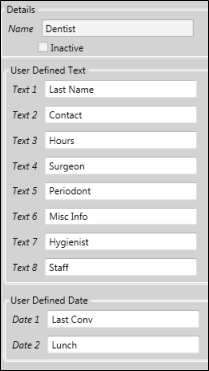 User Defined Text - You can define the captions for up to 8 user-defined text fields, such as CONTACT NAME and OFFICE HOURS. This provides you with a way to record information that is important for this type of professional. When you add this type of processional to your system, you will see the captions and can enter the appropriate information.