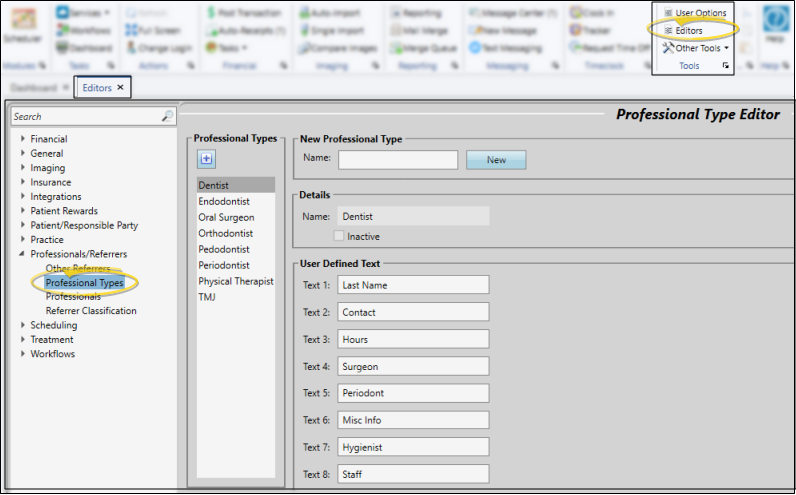 Select Editors from the Tools section of the Home ribbon bar. Then, from the Professionals / Referrers section, open theProfessional Types editor. (You can also use the Search field to look for the editor you want to work with.)