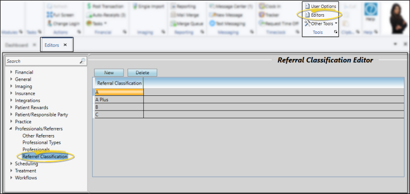 Select Editors from the Tools section of the Home ribbon bar. Then, from the Professionals / Referrers section, open theReferrer Classifications editor. (You can also use the Search field to look for the editor you want to work with.)