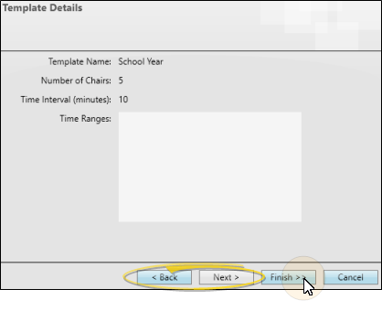 Review the choices you have made for this template. You can use the Back and Next buttons to toggle among the setup windows as needed to make any changes. When ready, click Finish to accept your settings and continue.