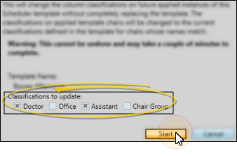 The reclassification process will update the chair classifications you have selected for each scheduling date that has already been assigned to this template, as well as dates that are assigned to this template in the future. If you made changes to a chair assignment (i.e. Office), but did not choose to update that classification, that classification will not be updated for dates that were already assigned to the template.