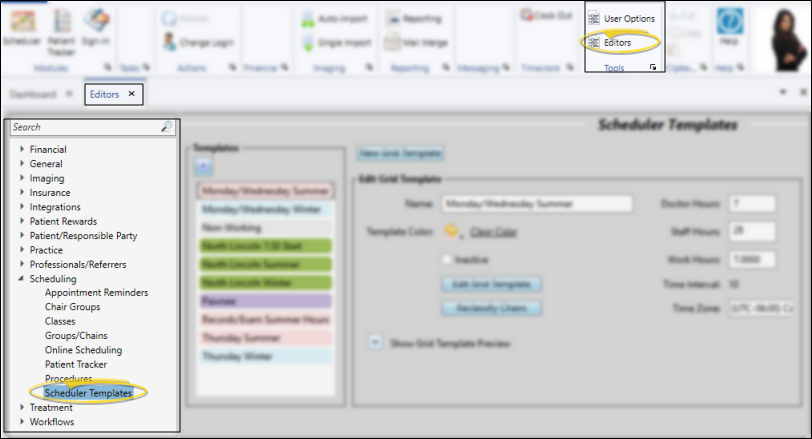 Select Editors from the Tools section of the Home ribbon bar. Then, from the Scheduling section, open the Scheduler Templates editor. (You can also use the Search field to look for the editor you want to work with.)