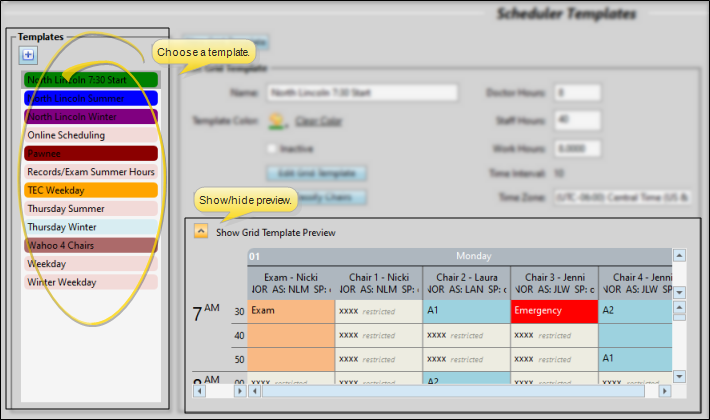 Use the Scheduler Templates editor to design your scheduling screens, including the number of chairs, time intervals, and cell classifications. You may create as many templates as you need to accommodate all your scheduling situations.
