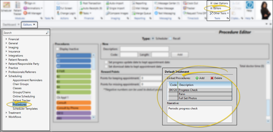Use the Default Treatment section of your Appointment Type / Procedure editor to assign default dental procedures to your appointment appointment type / procedures.See "Appointment Type / Procedure Editor" for details.