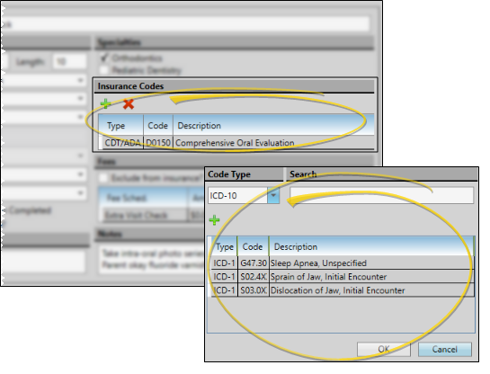 Use this section of the window to assign insurance codes to this dental procedure. Click Add, then select the code type (CDT/ADA, ICD-9 or ICD-10) and the code to associate with the procedure. You can add only one code for each code type: If you already have a code type associated with the procedure, that code type will not be available to select from, unless you first delete the previously added code. To remove a code, first click the code, then click Delete to remove it from the procedure. (See "Insurance Code Editor" for details about your insurance codes and types.)