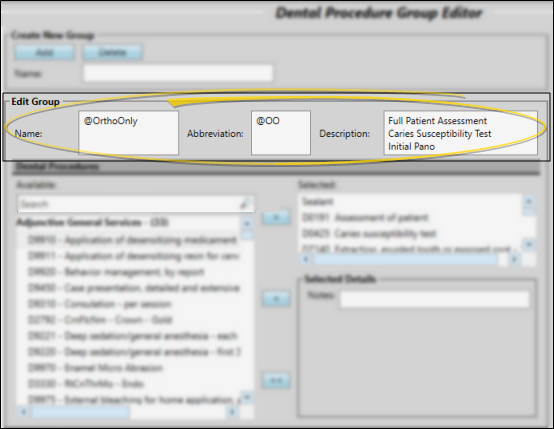 Use the Dental Procedure Group editor to manage sets of dental procedures that are most commonly scheduled together. This helps keep your appointment scheduling protocol efficient and consistent.